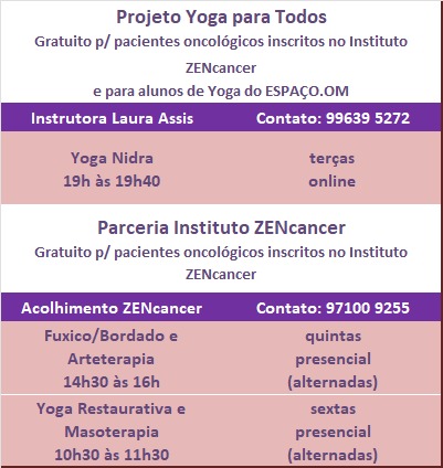 Em 20 de setembro de 2019, inauguramos a parceria com o Instituto ZENcancer, iniciando as práticas de Yoga Restaurativa no ESPAÇO.OM, do Projeto ZENcancer como a primeira ramificação, fora do YOGAPICs, dirigido por Luciana Lobo, em Botafogo.